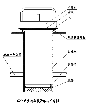 如圖所示為霧化試驗起霧裝置結構示意圖,試樣放在起霧玻璃杯的底部,并用壓樣環壓好,起霧杯放在恒溫油浴中,其上口平面為耐油耐高溫的氟橡膠密封圈,密封圈的上面即為成霧載體(即圖中標注G的位置),其上依次為濾紙、冷卻板。試樣在高溫下,其材料中的揮發性物質加速揮發出來,凝結在密封圈上面被冷卻板冷卻的成霧載體上。