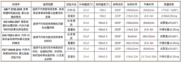 不同的霧化測試標準中,針對的內飾材料不同,并且對霧化試驗參數的要求也有所差異,下面列舉了常用的幾個霧化標準的具體參數: